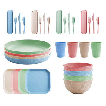 16pcs Mixed Color Trigo Palha Dinnerware Set Eco-Friendly Custom Atacado Talheres Gift Set com copos portáteis Bowls Placas